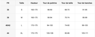 *En fonction de votre morphologie et de vos habitudes de style, les tailles ci-dessus sont juste pour référence.